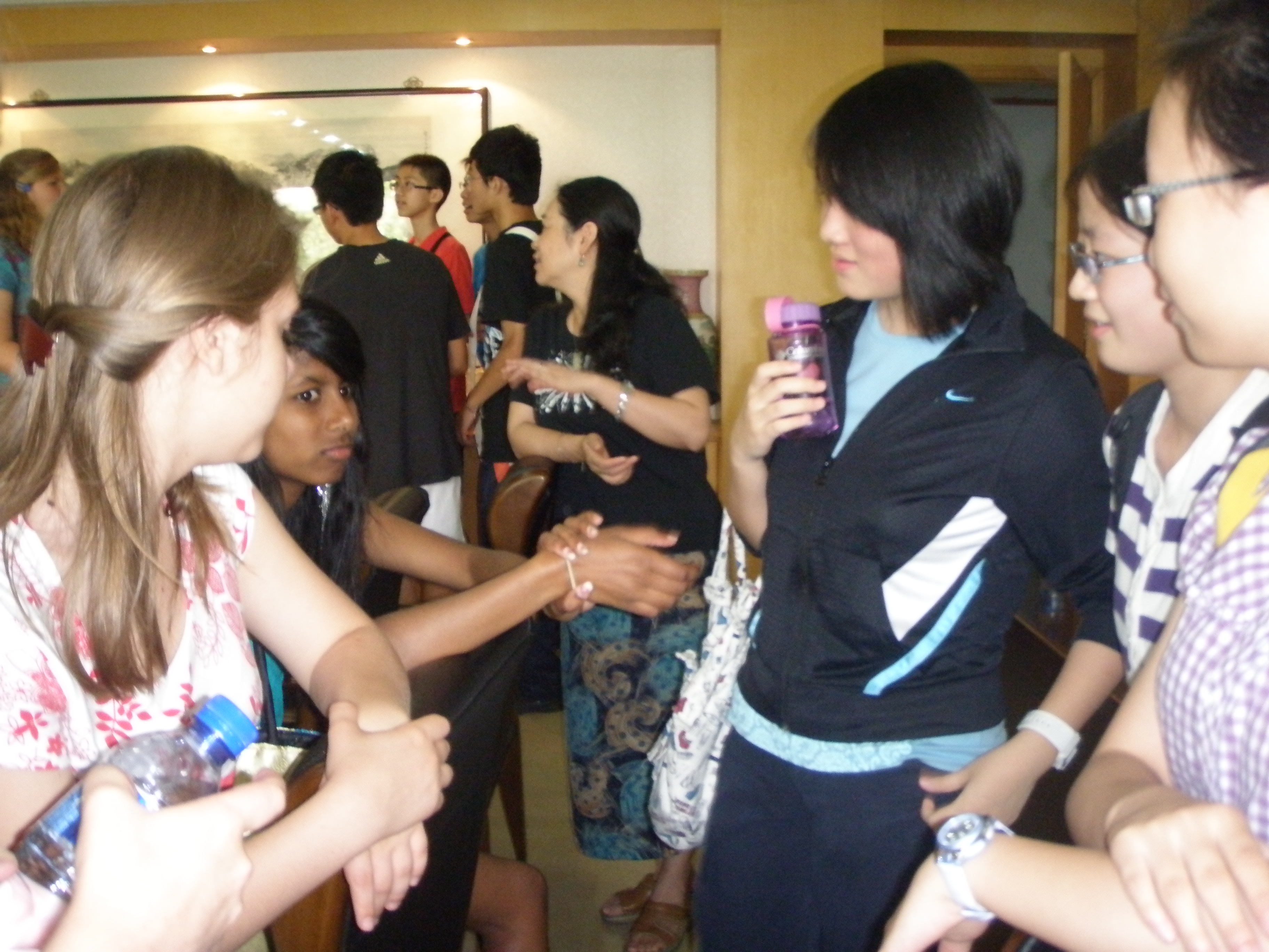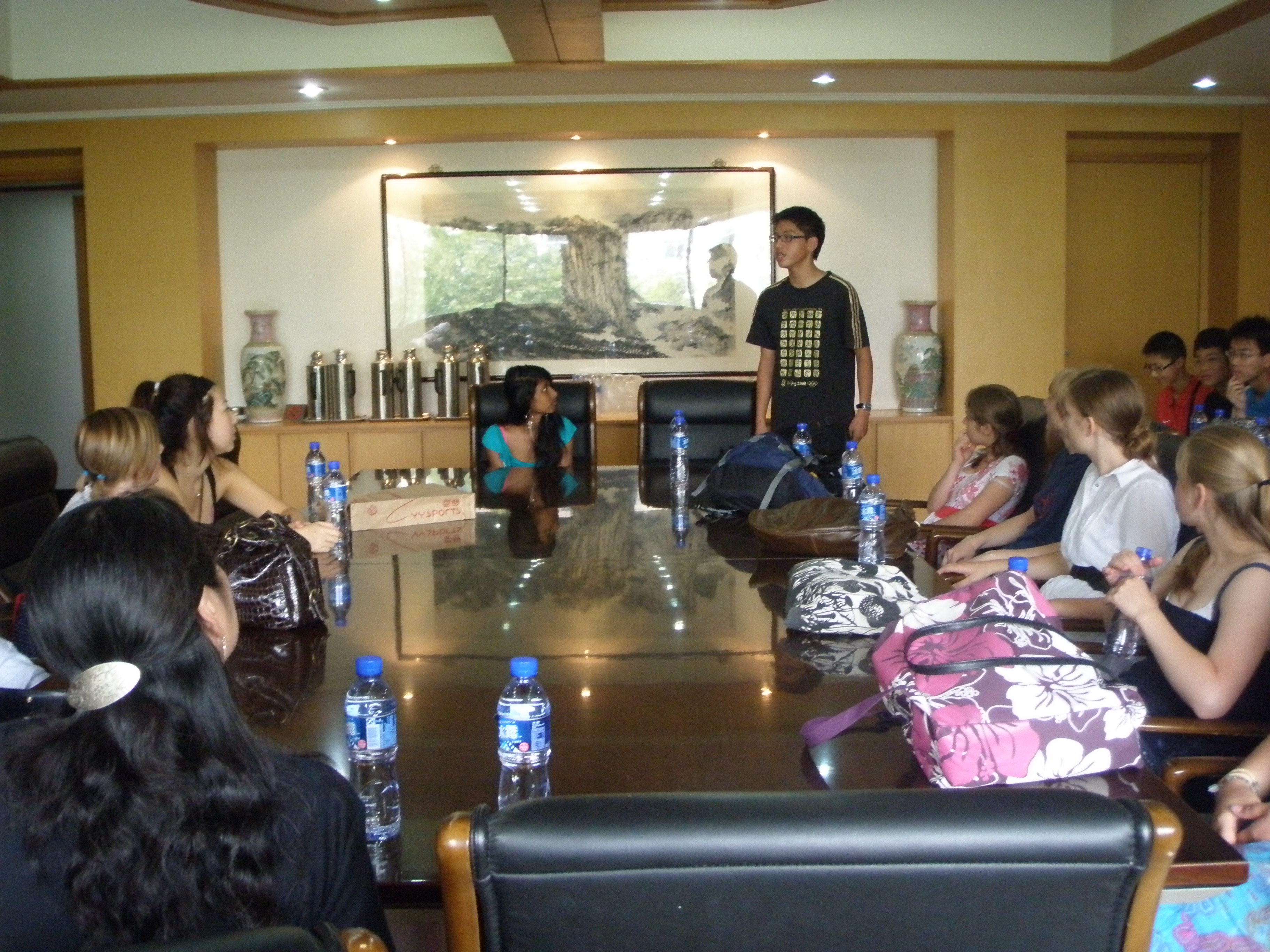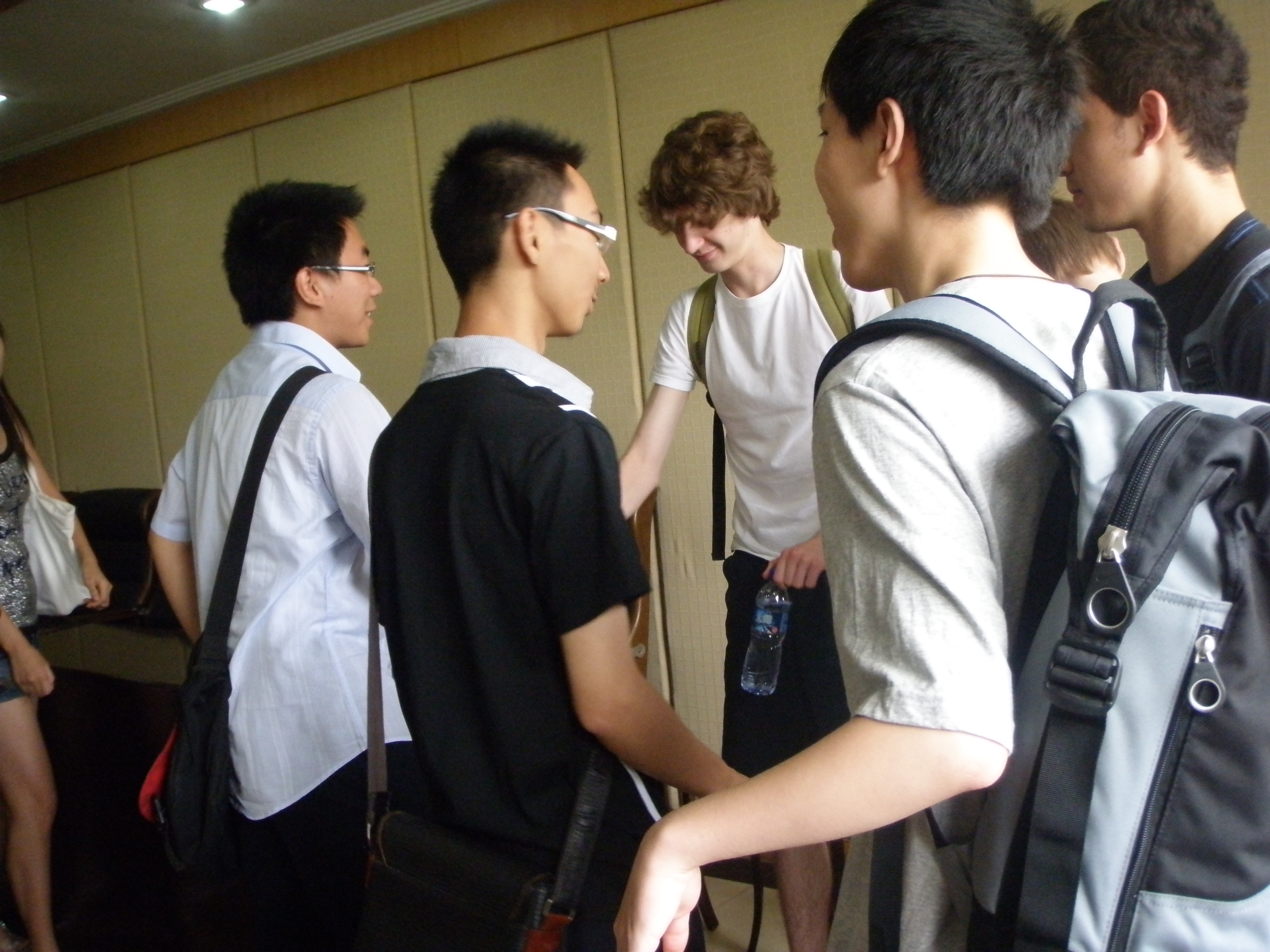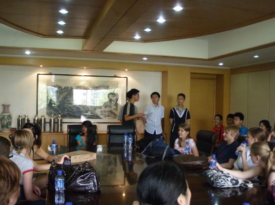 7月26日上午英欧中学的师生到达南外与南外学生见面,分配接待学生。大家在一起交流的内容包括许多方面,如自己的兴趣爱好,各自的国家,风土人情等。期间他们还花了一个小时在南外四周进行调查,之后大家坐在会议室里交流自己在这段时间的所见所闻,英国学生说出自己通过这一个小时对中国,对南外的认识。 下午南外学生把各自接待的学生接回家体验中国家庭。
