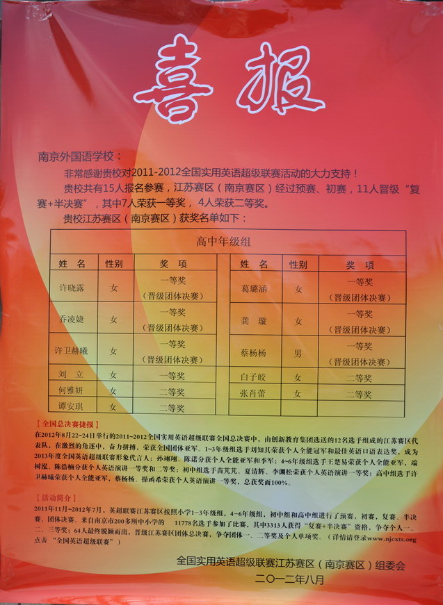 在2011-2012全国实用英语超级联赛活动中,beat36515人报名参赛,经过江苏赛区(南京赛区)预赛、初赛,11人晋级“复赛+半决赛”,其中许晓露、乔凌婕、许卫赫曦、刘立、葛璐璐、龚璇、蔡杨扬7人荣获一等奖,其中许晓露、乔凌婕、许卫赫曦、葛璐璐、龚璇、蔡杨扬还晋级团体决赛;何雅妍、谭安琪、白子皎、张肖蕾4人荣获二等奖。另外,许卫赫曦荣获个人全能亚军,蔡杨扬、操函希荣获个人英语演讲一等奖。
