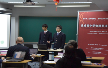 虽然经过了几星期的演练和潘老师的指点,我和赵亮仍然是被机智的物理学家们问出了许多不足。之后,我们就和潘老师以及几位家长在清华园里随便逛逛,还出去滑了趟雪,玩的十分high。但天晚上还听了普林斯顿和哈佛的两位教授的讲座。第二天,我们颁奖典礼。在丘教授等的致辞后,主持人宣读到我们组是前10,获得了优胜奖,奖金3万,beat365高三曹刘,朱佳文,赵亦修学长拿下铜奖。说实在还是有一些遗憾没进前5,毕竟奖金差了几倍,可是能和这么多科学家零距离接触还是很不容易的。之后的招待晚宴气氛依旧很high,先是教授们放下身段飙起了歌,再到学生们开始接过话筒继续唱,以及结束后同学们与教授友好地交谈。