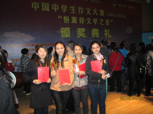 在刚刚结束的“恒源祥”全国中学生作文大赛总决赛中,beat365学子取得了骄人的成绩,杭一苇、池颖、宋奕、茆霖四位同学经过笔试、面试、演讲比赛的层层角逐,均获得全国一等奖。其中宋奕同学的表现尤为突出,勇夺本次大赛最高奖项“文学之星”称号,是江苏赛区唯一获该奖选手,杭一苇同学也获得了最高奖项的提名奖。