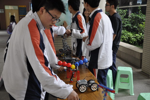 A楼大厅热闹异常,地上一块板子,2位初中学生的及其人,摆弄着各种姿势进行着格斗,是故意的作秀,场外围拢着一层层观看的人群。真好玩啊!这是怎么做出来的?是如何实现控制的?我想参加怎么办?精彩的机器人表演,不仅吸引了学生的观看,还激发了学生的兴趣,吸引了学生的参与和研究热情。