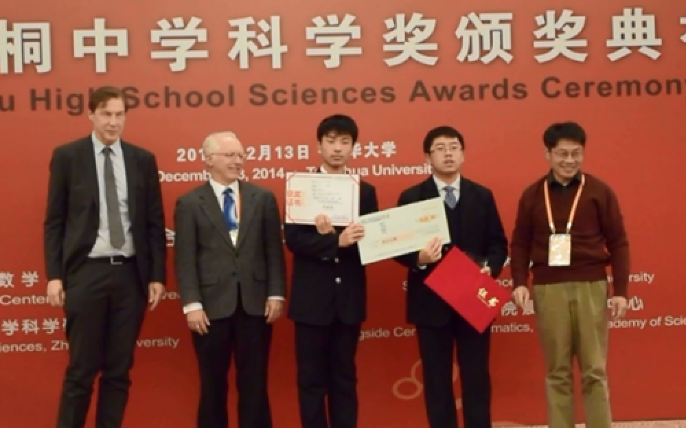 第二届丘成桐中学物理奖(S.T.Yau High School Physics Award)全球总决赛于2014年12月13日在北京清华大学落下帷幕。该项竞赛以学术创新为主题,以研究项目、撰写论文、论文答辩为形式,共有来自全球的418支队伍参加。经过论文初审、复评、复旦大学南部赛区决赛和清华大学全球总决赛共四轮角逐,在姚小琴、潘志民老师的指导下,beat365中文官方网站高三(1)班的曹刘、赵亦修和朱佳文同学的论文Hysteresis, mechanism for different looping modes and a different way of simulation in the case of a twisted rope在获得铜奖(决赛第4名)及6万元人民币奖金,高二(1)班赵亮和高二(5)张泽夏的论文A study of collisions between dominos获得优胜奖(决赛第9名)及3万元人民币奖金。可喜可贺!