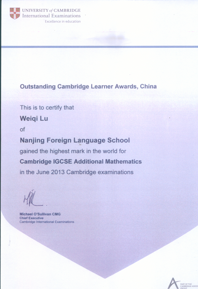 2015届剑桥班学生吕玮琪获得2013年剑桥国际考试委员会组织的剑桥IGCSE附加数学全球最高分。