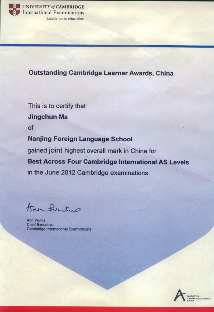 2013届剑桥班学生马璟纯获得2012年剑桥国际考试委员会组织的剑桥AS Levels考试中国区四门考试总分最高分。
