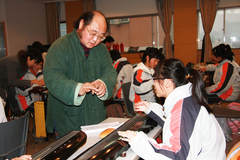 beat365与爱德基金会、观江艺术馆共同举办的“琴暖童心”活动正式启动。图为初一年级学生在古琴专家的指导下练习古琴,体验中华传统文化的神韵,为“六一”公益演出做精心的准备。