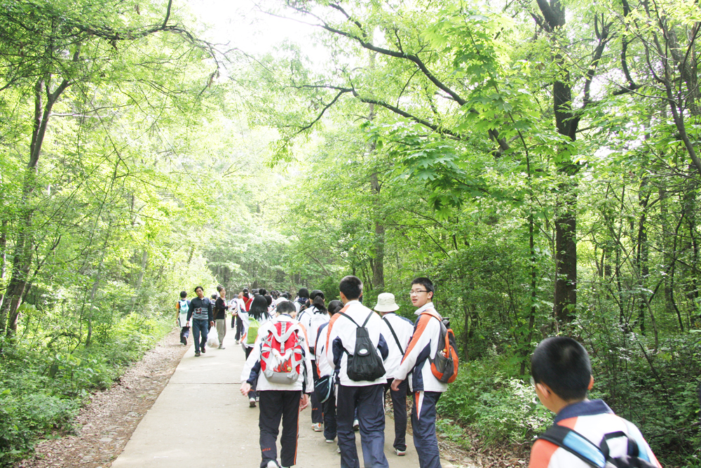 早晨的紫金山微风荡漾,风中夹杂着大自然的笑意。只一片"绿肺"在暮春的阳光之下显得挺拔而且耀眼。还没有走近就听到了同学们的一阵喧嚣。虽然天气比较热,但是大家都是兴高采烈,精神饱满。大家都是轻装上阵,没有带过多的行李,因为这次远足只有将近三个小时而已。远足是从登山栈道开始的,刚到山脚下,发现有很多人,我们和前面的队伍断开了,但还好,在走入了盘山小路之后,一切都变的安全了。道路两边的树木茂盛,时不时有鸟啼声回响,清脆动听。大约行走了半公里左右,在我们的左边开出一条道来。整个山路是石阶堆砌而成,道路很窄,并排只能容下两人。而我们很多人却一拥而上,道路显得不够,而且情趣破坏了许多,山林之间的静谧顿时转而变成了喧嚣,或者更确切的说那实在是吵闹。真正的赏美是在宁静之中体会出的,而真正的健身也不是在吵闹之中的,所以在此建议学校下一次选择分散的目的地。