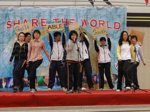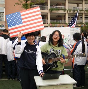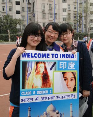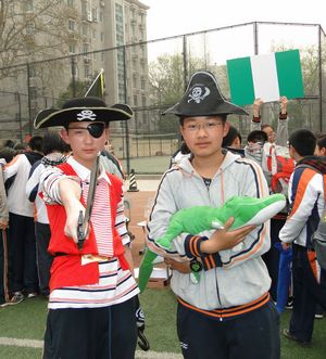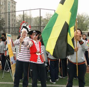拉开序幕,操场四周周摆放着由各班同学自己设置的不同国家的展台,约有40多个展台,而各个展台都是由同学们自己策划、设计,展台上展示着某一国家的国旗及自己设计的代表该国特色的印章、还有代表该国特色的陈列品等等。