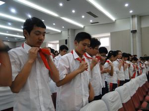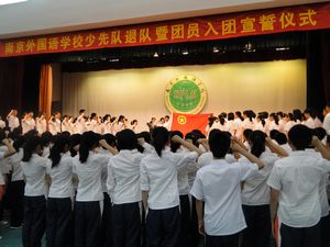 伴随着激昂的出旗曲,同学们最后一次庄严地向队旗敬少先队队礼,重温了在队旗下的誓言。初二年级学生代表总结了少先队生活,并展望未来。随后,在激昂的少先队队歌中,同学们不舍地解下胸前的红领巾,珍藏起来。随着少先队队旗的退场,全体初二年级同学正式退队。