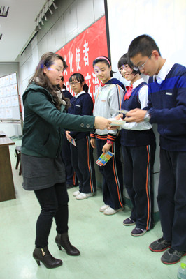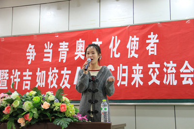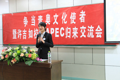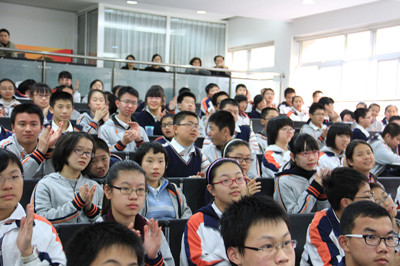 11月22日,在“校友许吉如APEC归来交流会”上,初二同学们在认真聆听许吉如、陆韬羽两位学