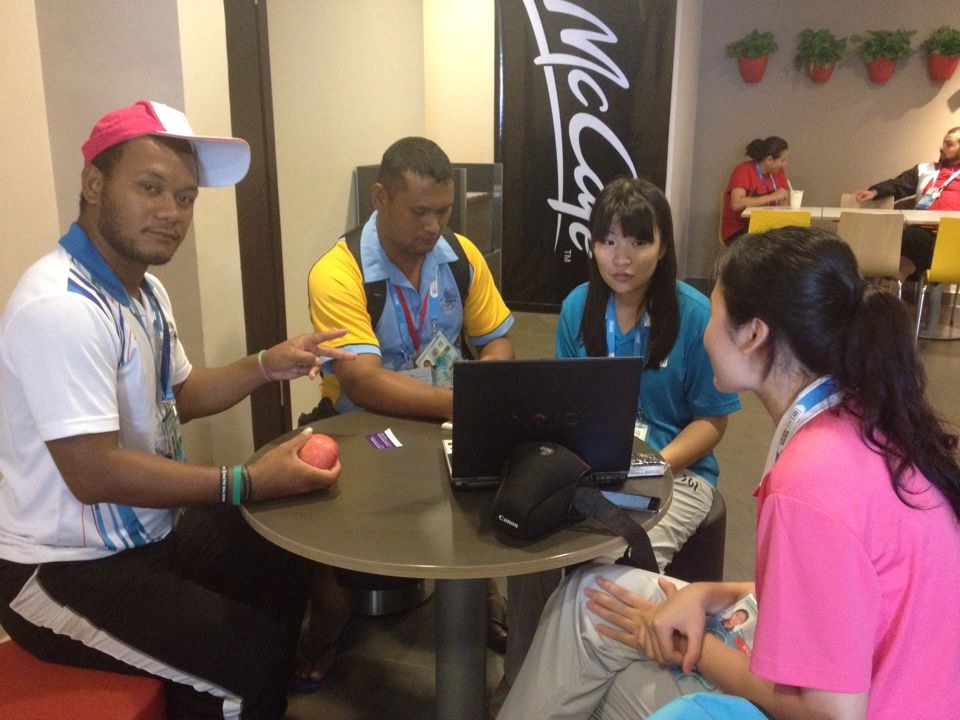另外我们原本听说他们只来一个运动员,我们还想告诉他们,我们曾经也有一个运动员参加奥运会。但他们告诉我们其实来了两个项目三名运动员:女子沙滩排球和一名飞盘运动员!大大超出我们的预想,让我们也惊喜了一下!图瓦卢仅有10000人,常驻人口也仅5000,如果不是青奥会估计没有太多人知道这个美丽的岛国,现在我们对它熟悉起来。也知道它面临的困境,因此我们想通过这次文化互动环节让更多的人了解、熟悉、和喜爱上它!