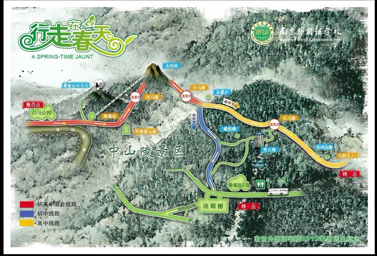 初中、中英:从南京白马高尔夫俱乐部门口(白马公园旁)集合出发经紫金山至中山陵水榭。点名后解散。