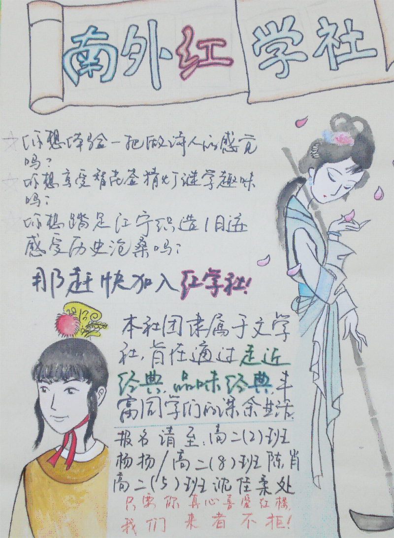 红学寄予:从诗词到民俗,从人文到社会,南外文学社红学分社始终是古典文化爱好者的温馨世界。