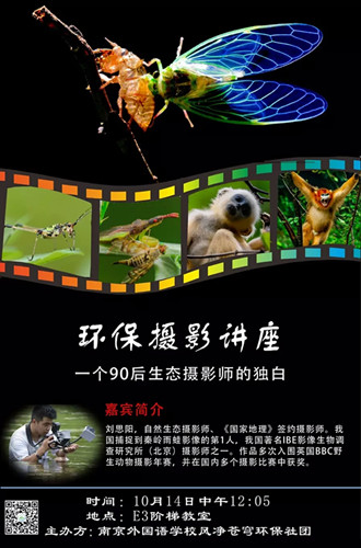 10月14日中午,由风净苍穹环保社团主办的公益环保摄影讲座在beat365中文官方网站E3阶梯教室举行,环保社邀请《国家地理》签约摄影师刘思阳为同学们做了一场题为“中国自然之美”的生态公益讲座。
