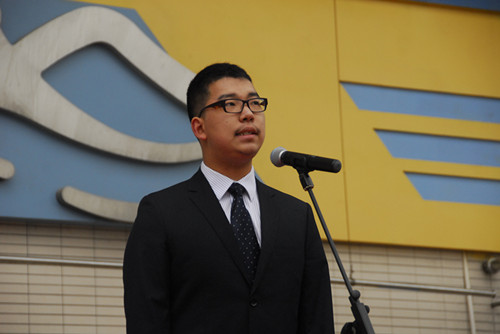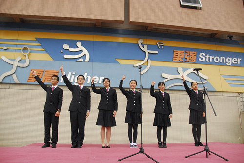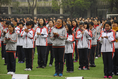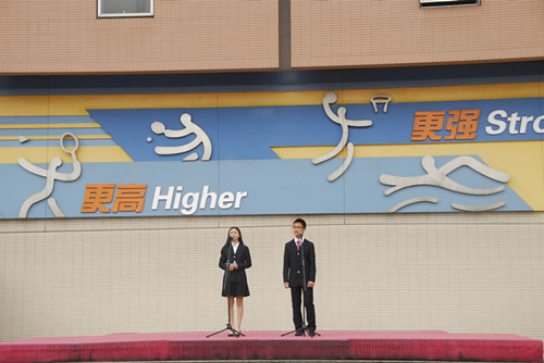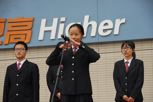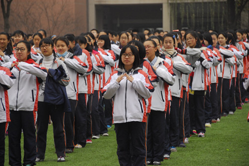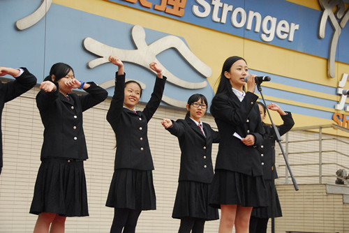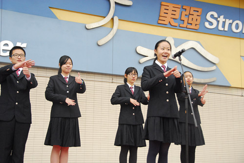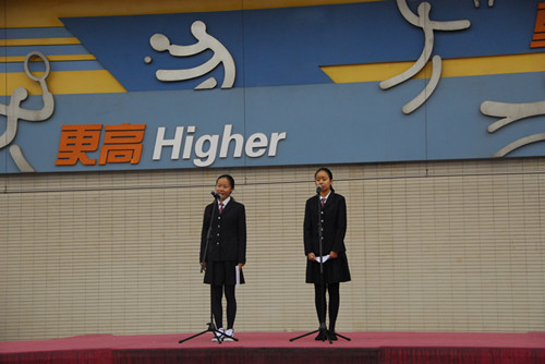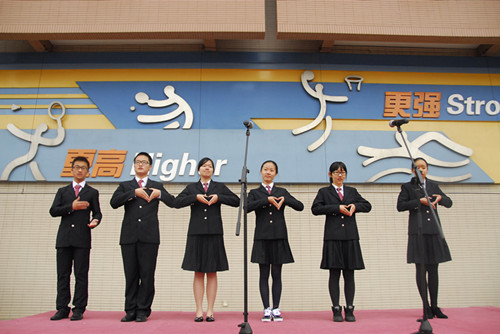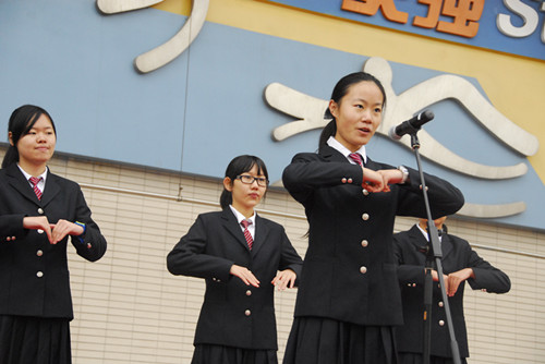 H:感谢郑中元同学的发言,在学农期间,基地老师还教了我们和聋哑人交流用的手语,下面请高二学生代表向我们介绍手语并表演手语歌《风中的羽翼》