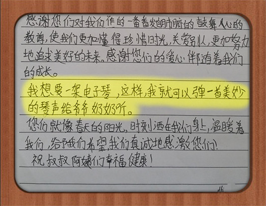 她,梦想拥有一架电子琴,可以弹一首美妙的歌曲给爷爷奶奶听。
