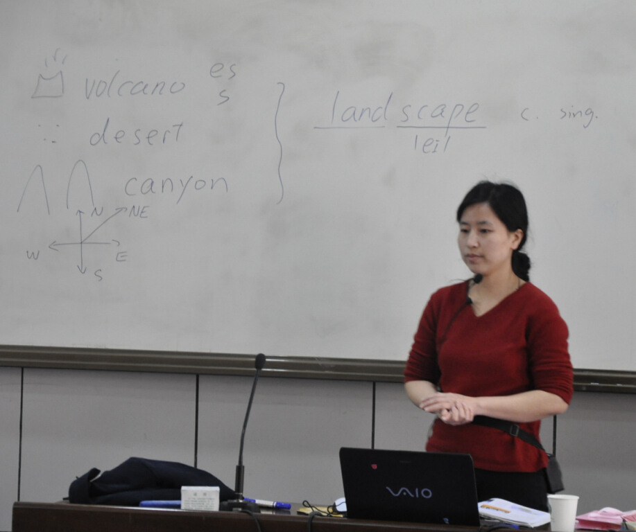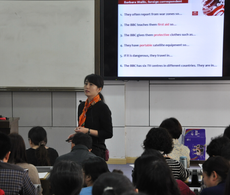 第一节课,吕渊老师上了一节精彩的听说课。文章选自《剑桥英语》第三册, 课文的题目是Auntie’s News,课堂上她循循善诱、抽丝剥茧式地引导学生在听说过程中一步步展开讨论,了解战地记者及其工作的艰辛,引发学生思考。