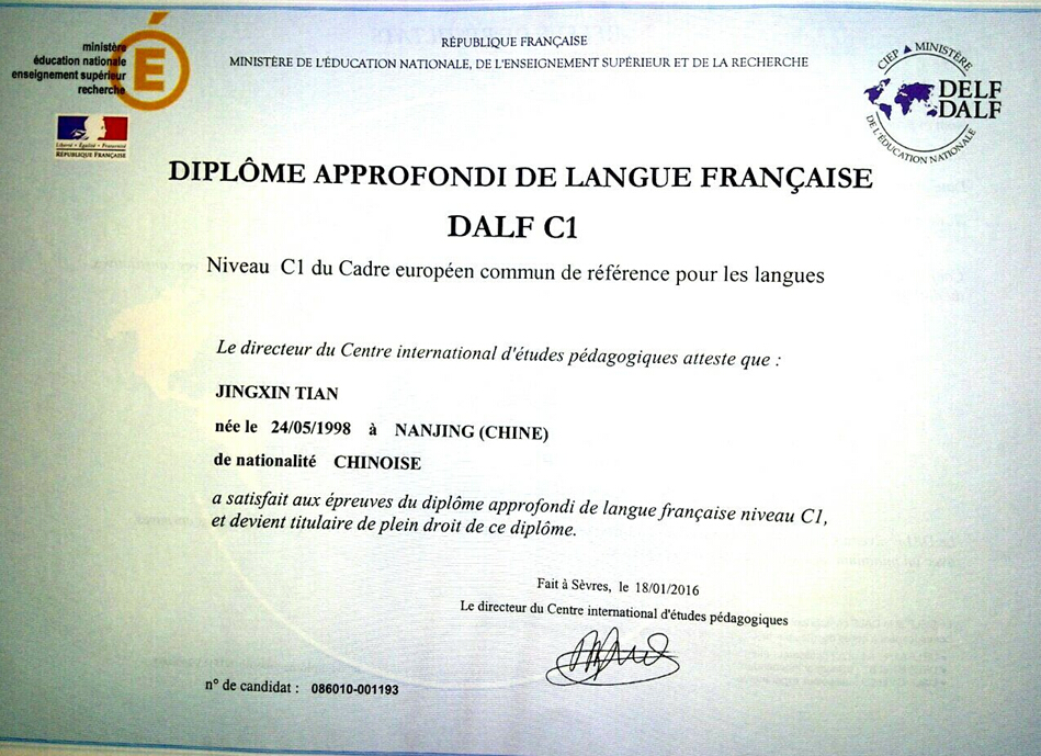 2016年1月 高三法语班田晶鑫通过考试获得欧标C1等级文凭,这是法国及加拿大对国际学生研究生入学所要求的语言文凭