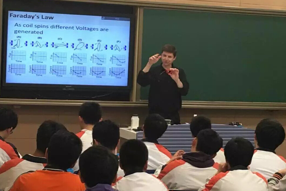 巴奈特教授首先为beat365高一年级选修STEM 课程的学生开设了《磁感应电动机的设计和应用》一课,与学生展开了互动科学探究。他新颖的理念、精妙的设计和风趣的言语引起了在场学生的极大探究兴趣。