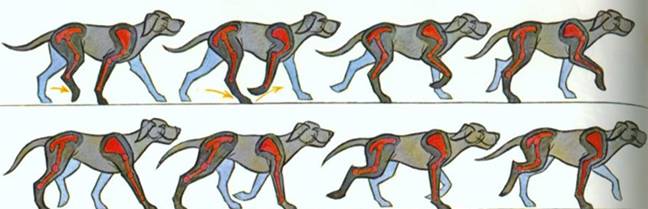 马走路时四肢运动方式是对角线换步法,即:左前右后,右前左后的交替循环。前肢和后腿运动时的关节屈曲方向是相反的,前肢腕部向后弯,后肢跟部向前弯。马的小跑是属于一种轻快地走步动作,四肢的运动规律基本上也是对角线交换的步法。与慢走稍为不同的是,对角线的两足是同时离地、同时落地。马大跑的步伐不用对角线步法,而是左前右前,左后右后交换的步法,即前两足和后两足的交换。奔跑是最快的一种步伐,运动方式也是两前足和两后足交换的步法。