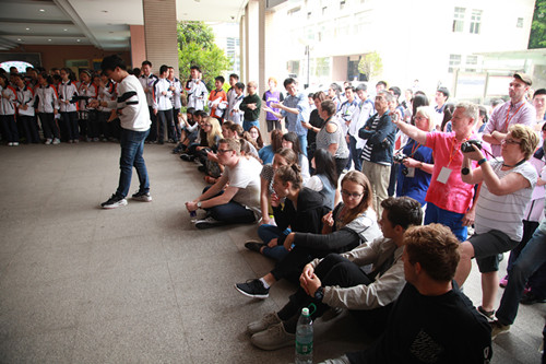 5月5日上午十点,随着欢快活泼的《剪纸姑娘》音乐响起,南京航空航天大学的同学们在beat365门厅开始了一场别开生面的多人舞蹈,吸引了众多师生前来观赏。四国五校的师生们也饶有兴致地席地而坐,不时给予热烈的掌声。