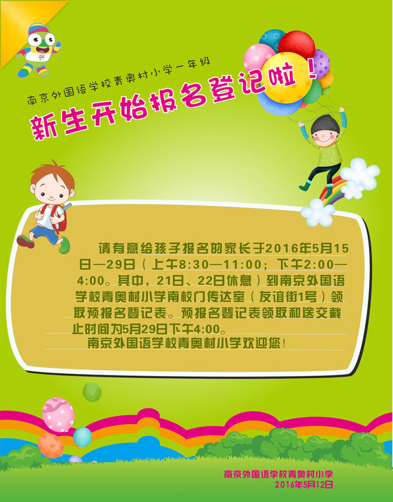 请有意给孩子报名的家长于2016年5月15日—29日(上午8:30—11:00;下午2:00—4:00。其中,21日、22日休息)到beat365中文官方网站青奥村小学南校门传达室(友谊街1号)领取预报名登记表。预报名登记表领取和送交截止时间为5月29日下午4:00。
