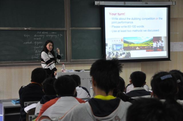 第一节课,朱姗姗老师上了一节阅读课,课题是剑桥三的Unit 25 The BBC News Service。她着重于学生根据上下文猜测词义这一阅读技能的培养,并且在阅读过程中不断启发学生的思维,引导学生进行深层次的思考,取得了较好的教学效果。
