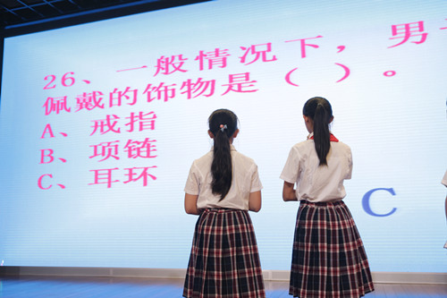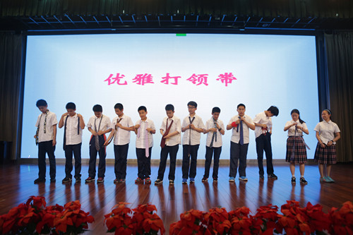 活动分为优雅打领带、得体站坐行礼仪知识问答和礼仪情景剧四个部分。被抽到学号的同学要上台比赛打领带和展示站坐行姿态。有人因担忧抽到自己而慌乱,有人因被抽中而激动,当然还有为本班参赛同学而欢呼。台下凌乱的心情与台上五花八门的领带系法相映成趣。上台展示站坐行姿态的同学们都有些拘谨,甚至有点手足无措,不过同学们都聪明地边展示边学习,后面几轮上台的同学越做越好,越来越自信得体。观众们也受益良多。