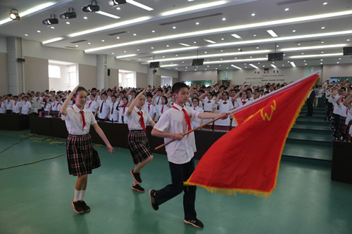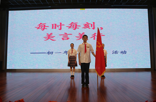 5月31日下午令人期待的庆六一“每时每刻,美言美行”礼仪大擂台在报告厅举行。身着正装的全体初一同学欢聚一堂,庄重而欢脱地享受这一时刻。高昂的少先队歌响彻全场,鲜艳的队旗照亮我们的眼睛,少先队会一开场就让我们热血沸腾。