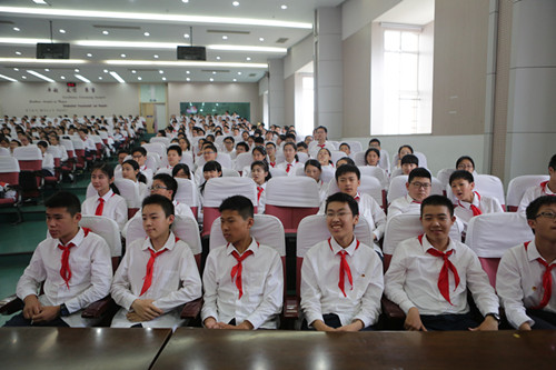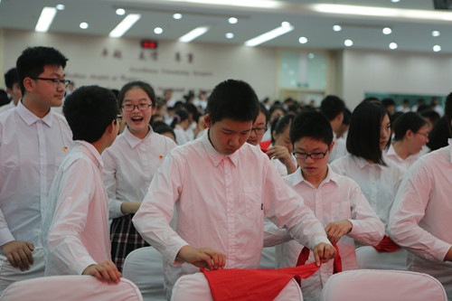 2016年6月1日,对于beat365中文官方网站的2014届初二年级同学来说,是个意义非凡的日子。当日下午,初二年级同学们参加了师生们共同精心准备的青春仪式。活动的开始,同学们先观看了一个记录了同学们从小学到初中的点点滴滴,令人回味的纪录片。这里面,有同学们对自己的寄语,还有辛勤哺育他们的家长,老师,校长对同学们的鼓励与期待。接着,随着庄严的队歌响起,同学们最后一次戴上红领巾,唱起了这首热情澎湃的队歌。一曲终了,同学们缓缓摘下胸前的红领巾并认真折叠,细心的将这个鲜艳的,陪伴了他们多年的红领巾收好,向着更广阔的明天迈去。随后,在校团委书记尹荷蓉老师的领誓下,第一批入团成员走到台上,面对团旗庄严宣誓。铿锵有力的誓词,表达了新团员对共青团组织的尊敬与向往,希望他们能在今后的学习与生活中做同学们的好榜样,坚决拥护团组织,做一名光荣的共青团团员。在这个特别的日子里,高中的优秀团员代表们也带来了对新团员的温馨寄语。