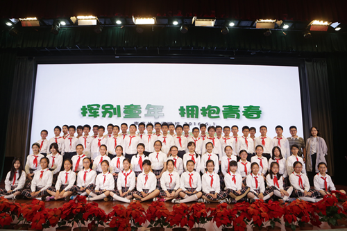 观影结束后,各班同学佩戴红领巾,最后一次站在舞台上合影,这将成为我们永远的纪念。