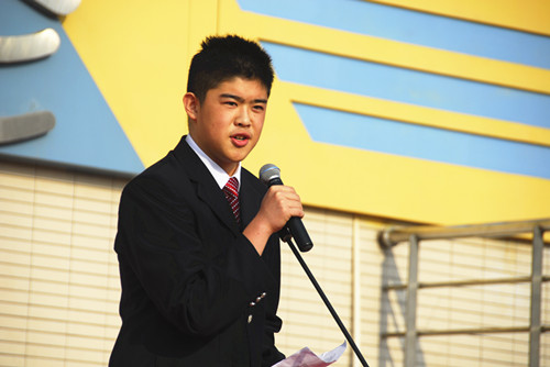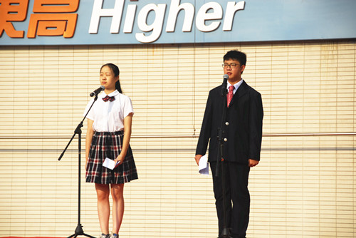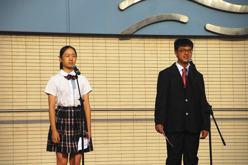 侯畅、戴佳睿:敬爱的老师,亲爱的同学们,大家早上好。我是来自高二2班的戴嘉睿,我是来自高一6班的侯畅。