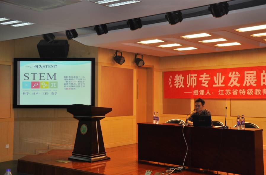 最后,南外本部章熙东老师就过去一年中,依托学校的省课程基地,开展STEM教育在生物教学中的尝试,呈现了《让STEM进课堂——对校本教材开发的思考》的微报告。章老师主要从STEM的由来及发展、STEM教育在中国、STEM教育在南外三方面,介绍了 “STEM+”这种新颖的教学理念和教学方式,用自己的亲身经历谈到了对STEM生物校本课程开发的思考,让参与研讨的老师深受启发。