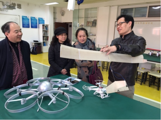 在会议的间隙,邹正校长、周弋副校长、教学处胡葆青副主任、信息竞赛教练李曙老师一行,在人大附中周龙平校长的陪同下参观了人大附中的通用技术实验室。通用技术教研组长李作林老师首先向大家介绍了人大附中的无人机科学与工程实验室,以及无人机课程的实施,邹正校长和周弋副校长都饶有兴趣地询问关于无人机制作的一些细节,李老师做了一一解答,并且介绍了实验室内展出的优秀作品。