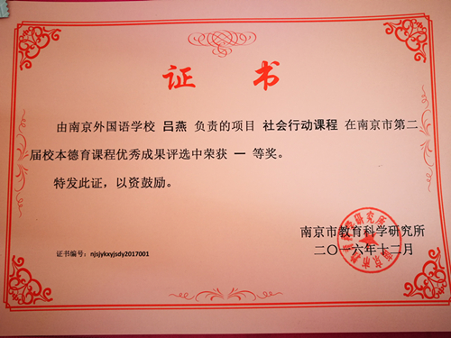 beat365吕燕老师负责的项目“社会行动课程”荣获优秀校本德育课程一等奖。