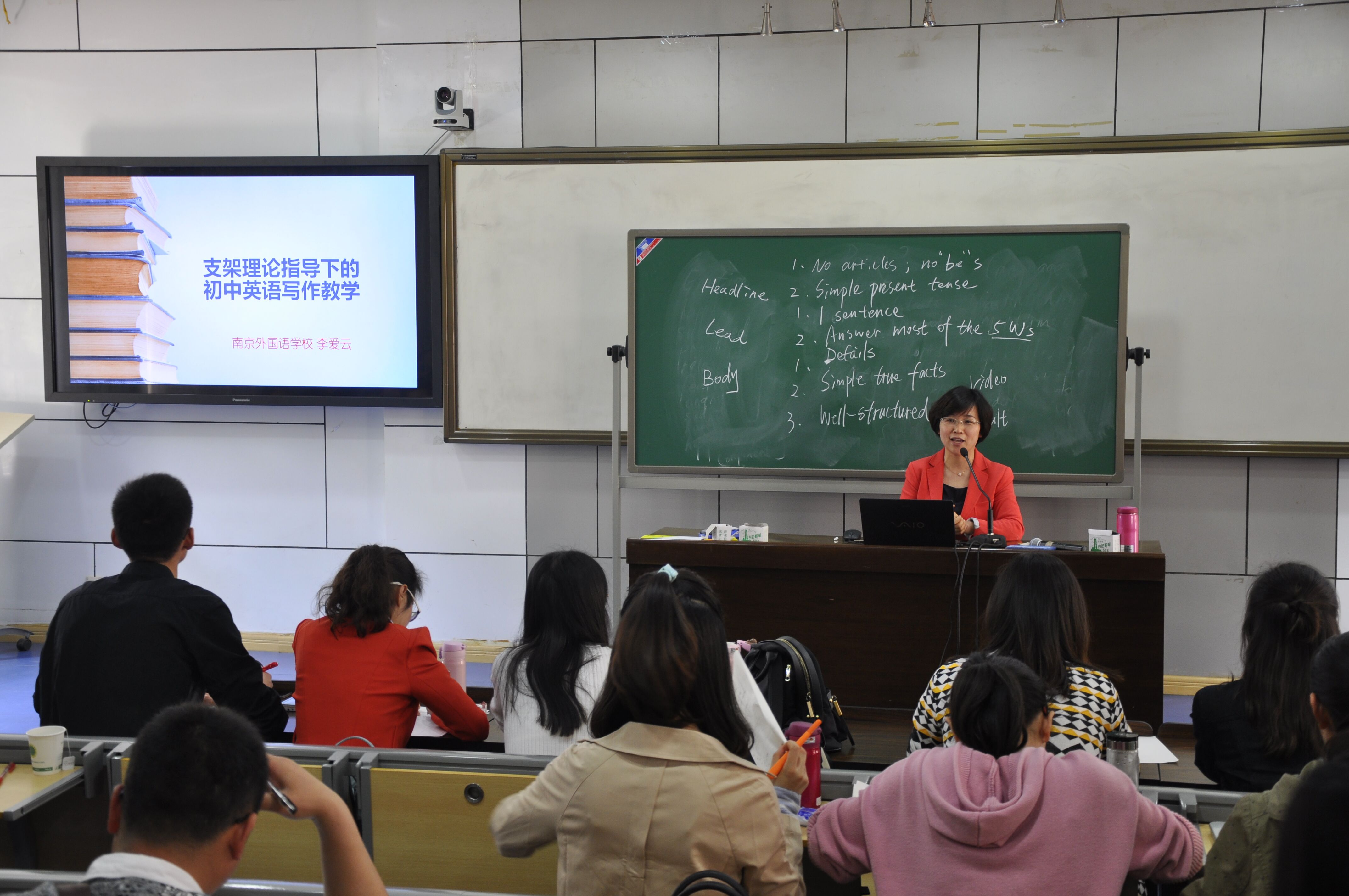 2017年4月24日上午,“南京市初中英语李爱云名师工作室”活动暨南京市初中英语教研活动在beat365二楼阶梯教室举行。本次教研活动的主题是“支架理论指导下的初中英语写作教学”,旨在研讨和探究如何在初中英语写作教学中,在充分调动学生知识储备的前提下,教师帮助学生搭建写作需要的情境、内容、结构、语言、评价等“脚手架”,以完成不同文体的写作。