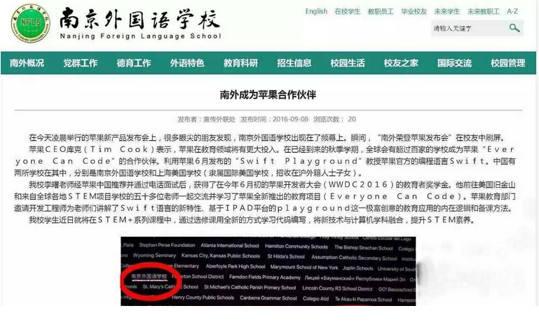 在2016年南外作为全国唯一的一所公立学校获得了苹果公司的支持,依托STEM+项目开设了苹果合作课程Everyone Can Code。学生在STEM+系列课程中,通过选修课用全新的方式学习代码编写,将新技术与计算机学科融合,提升STEM素养。胡清阳是该选修课的一名学生。