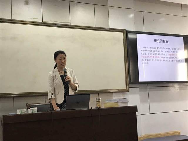 柳咏梅老师向到会的领导和老师们介绍了她主持的“网络环境下初中语文读写共生教学研究”课题的研究情况,从研究目标、研究内容、研究方法、研究队伍以及已经取得的成果等多个方面直观地呈现了课题研究的总体情况。与会老师们纷纷赞叹课题的丰硕成果。