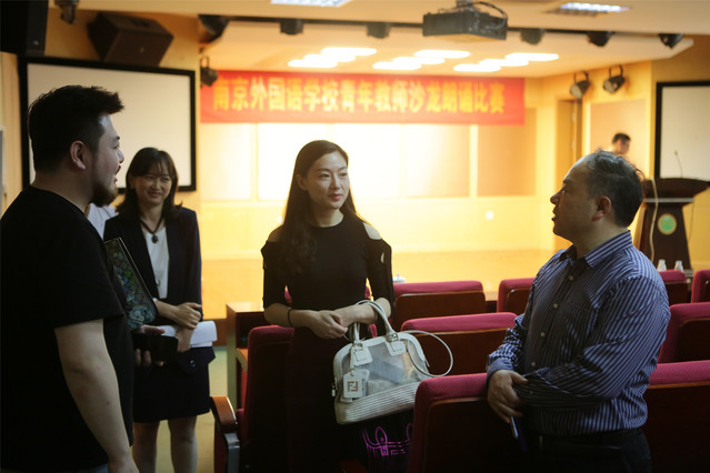 5月10日下午,南外青年教师沙龙在小剧场如期举行。南京电视台新闻主播钱琨老师和省演艺集团导演王政老师作为嘉宾再次莅临,并担任朗诵比赛的评委。连凯副书记、朱胜强老师、蒋薇老师、顾西兰老师、朱善萍主任等也全程参加了朗诵比赛,并担任评委,本次活动由章其帮、陈明洁老师主持。