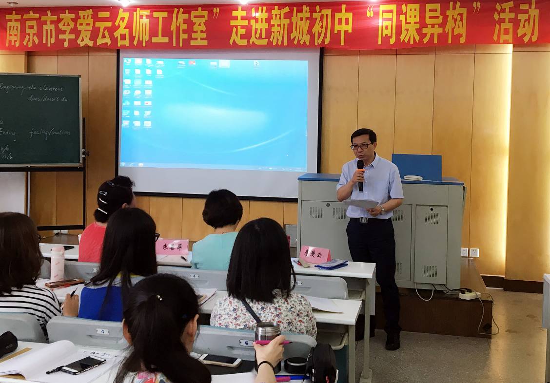 2017年6月5日,“南京市李爱云名师工作室”走进南师附中新城初中举行了一次“品读英文诗歌,提升阅读素养”的主题活动。新城初中的李慧玲老师与来自beat365中文官方网站的吴蓥老师分别对初一学生开设一节诗歌阅读欣赏课;教授级中学英语高级教师、省教研室何锋副书记和全国人大代表、教授级中学英语高级教师、江苏省英语特级教师朱善萍老师亲临现场指导点评。参与此次教研活动的除了工作室成员外,还有南外集团和建邺区的部分英语老师。本场活动由新城初中教科室主任乐建新老师主持。