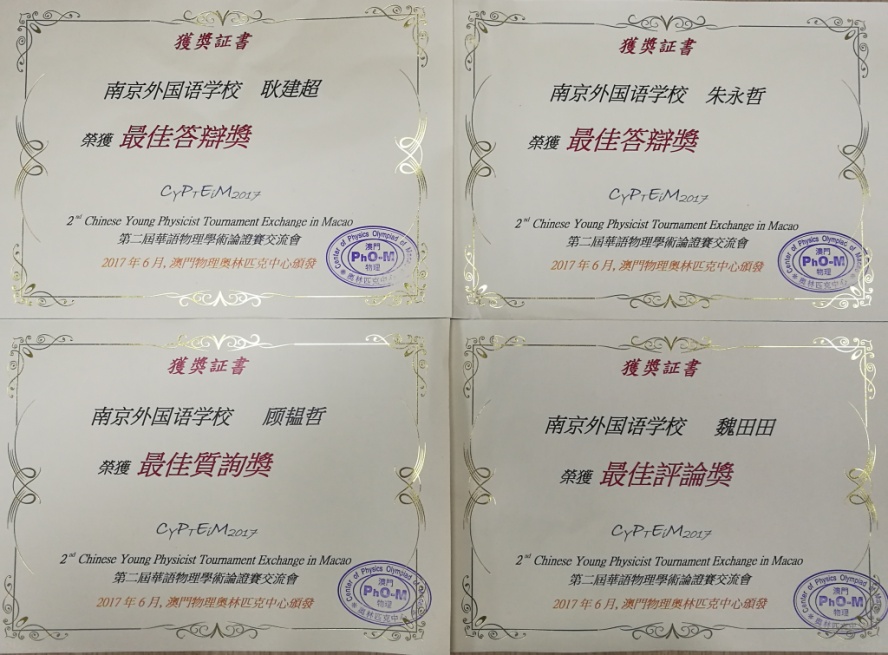 6月2 -5日,第二届物理学术论证赛交流会(CYPTEIM2017 & MYPT2017)在澳门大学成功举办。此次比赛分为英语和华语两个分赛场,共有来自大陆、澳门和台湾的共13支代表队(英语4队,华语9队)参加。beat365派出英语队“圆桌武士队”和华语队“敏而好学队”参加比赛并取得骄人成绩。