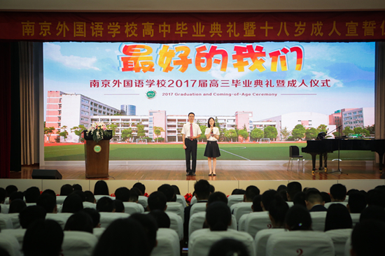 毕业典礼有三个精彩的主题发言:邹正校长回顾了2017届学生取得的辉煌成绩,代表学校向毕业生提出了“立大志,致良知”的希望;王宏琪先生代表家长表达了对学校的感激以及对孩子们的谆谆嘱托;被哈佛大学录取的李瑞怡同学代表学生,感谢南外给他们烙下独特的精神印记,对母校表达了真挚的祝福。