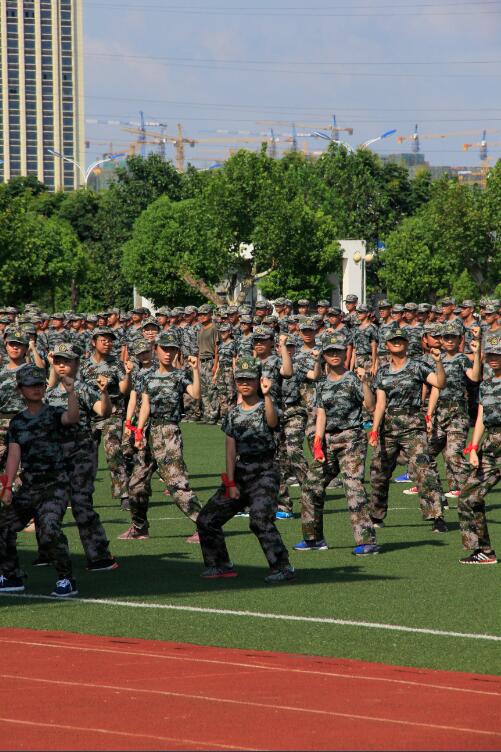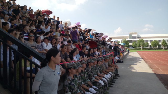 烈日炎炎,操场上坐满了家长,同学们精神饱满,整装待发。下午午14时45分,五星红旗伴着庄严的国歌升起,汇报典礼正式拉开序幕。分列式开始,在校旗的率领下,踏着《中国人民解放军军歌》的节拍,参训学员步伐整齐、口号嘹亮,10个方队依次通过主席台接受检阅。随后进行了课目汇报表演,男生拳术、女生拳术、队列示范班的表演刚劲有力、动作到位,最后女子队列操的汇报让人耳目一新,受训学员动作整齐划一、声音铿锵有力,表现出熟练的技术动作和勇敢的战斗精神,充分展示了军训的教学成果。