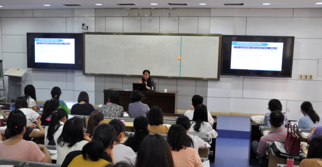 余卫星老师的讲座从命题入手,以“全”为关键词,详细讲述了英语试卷命题中的全面原则,以及试题中各种题型的命题要领和注意事项。余老师引用丰富的正、反面例子,对其进行剖析和讲解。与会的老师们在余老师的启发下全程参与思考和讨论,现场互动热烈,扫清了很多老师在试卷命题方面长久以来的疑问和认识误区。她幽默风趣的风格,潇洒沉稳的气质,给参加讲座的老师们留下了深刻的印象。
