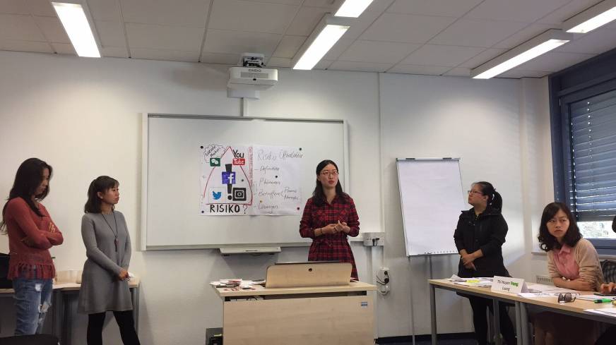 此次培训最重要的一个版块是提高教师自身德语语言能力。我每天上午都有长达四个小时的课程,语言课程涵盖了听、说、读、写四个方面,我们研究学习的主题涉及各个领域:德国风土人情、政治体制、历史文化、前沿科技、社会矛盾等等。通过语言培训,我们不仅提高了德语基本功,还拓展了自己的视野,学到了很多新知识。语言培训教师Sandra Trepper在教学过程中也向我们推荐了她平时教学以及出题时会用到的一些非常实用的方法以及辅助软件。培训期间,我们进行了多次小组报告,比如每个小组在网上找一首受欢迎的德语流行歌曲,然后利用这首歌作为教学资源,设计出一堂生动有趣,寓教于乐的德语课;比如针对“社交软件的风险”这一话题小组讨论,设计海报、列出提纲,进行小组汇报演讲,并对社交软件的风险提出我们自己的建议和措施。