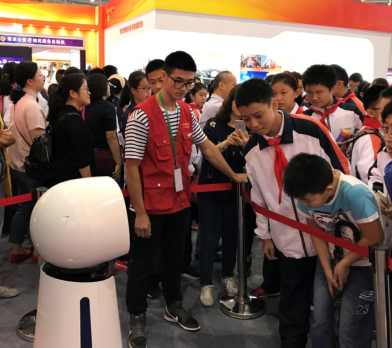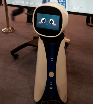咦?好嗲好萌的声音哟!定睛一看,原来是一个可爱的智能机器人,在跟它面前的学生打招呼呐!