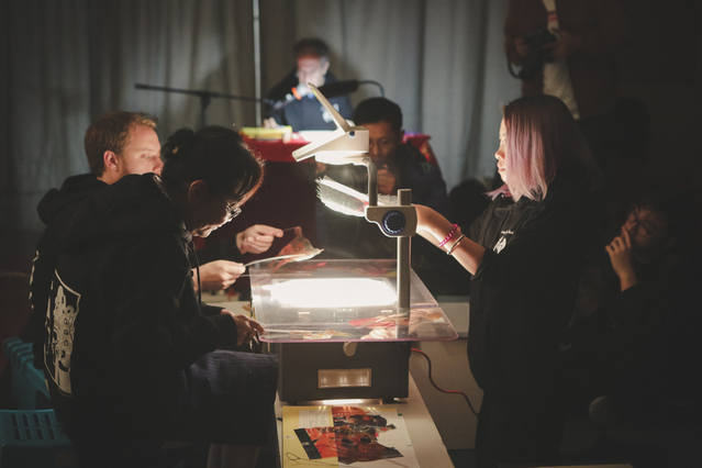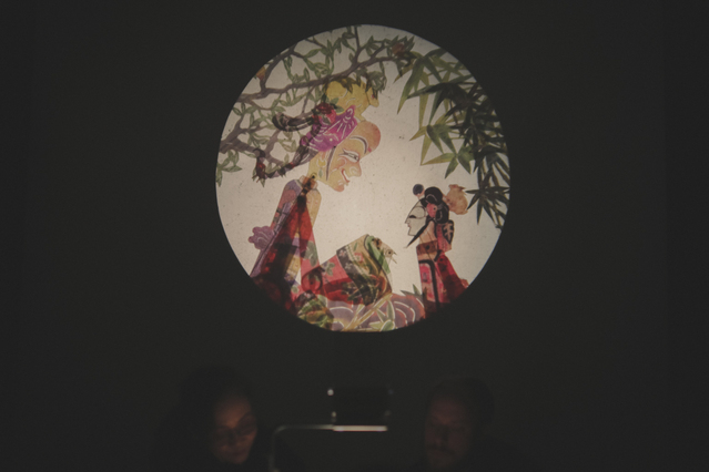 我们看到,与传统的皮影戏不同,幕布并不透明,前面放了一张低矮的工作台,上方架着一个投放设备。原来这样是为了适应更大的屏幕,在百老汇的演出也采用了这种方法。我们都深深感叹,科技与艺术竟然如此和谐自然,相辅相成!