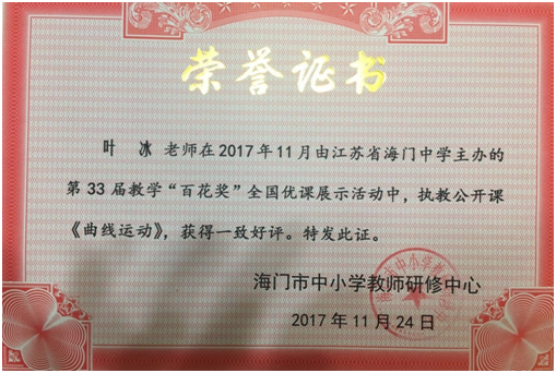 beat365叶冰老师受邀于2017年11月25日在江苏省海门中学主办的第33届教学“百花奖”全国优课展示活动中执教公开课《曲线运动》,获得一致好评。