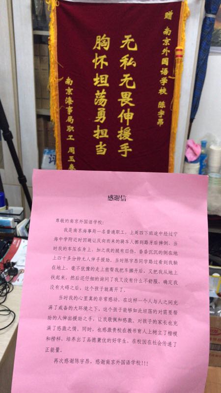对于锦旗和感谢信,陈宇昂表示,这样一个渺小的举动不值得这么高调地被感谢,他希望同学们在自己力所能及的范围内更多地帮助别人,让南外的正能量温暖更多的人。