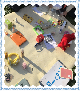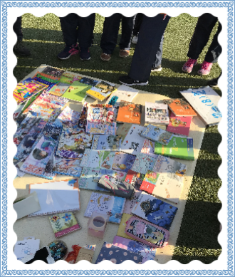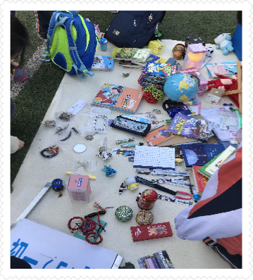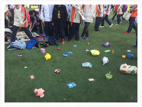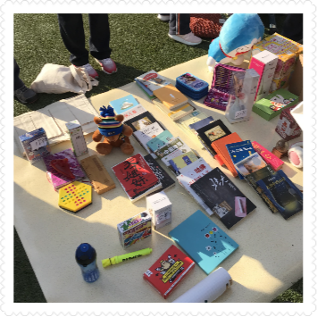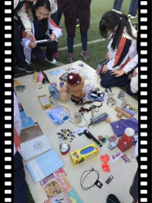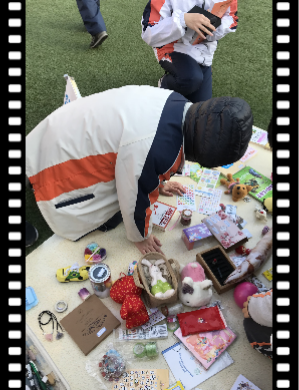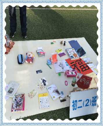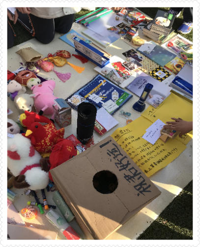 每个班级的摊位都经过同学们的精心布置,摆放着各式各样的文具,书籍,玩具,工艺品。有的同学忙着收钱,又有热心的同学扯着嗓子帮忙吆喝。整个操场热火朝天!