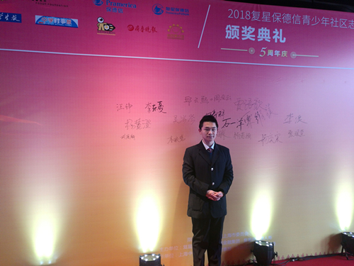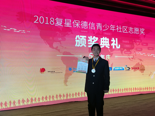 3月16日至17日,beat365高三(1)班的汪铮同学代表南京市参加了在上海举行的2018年第五届复星保德信青少年社区志愿奖(以下简称青社奖)颁奖典礼,并参加了2018年中国青少年公益发展论坛。本届青社奖共征集到了来自上海、北京、山东和江苏118所学校的1136个申请案例,汪铮同学在评奖中获得了银奖和“明星志愿者”荣誉,是首个获得青社奖的南外学子。